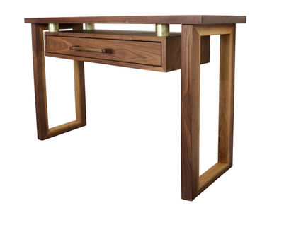 Optimal for an entry hallway or foyer, providing both function & style. Distinct brass accents capture your eye while highlighting the light tones in the wood. Equipped with a custom solid brass bar handle & smooth, handcrafted wooden drawer slides. Large floating drawer provides perfect storage for keys, personal items, or mail.